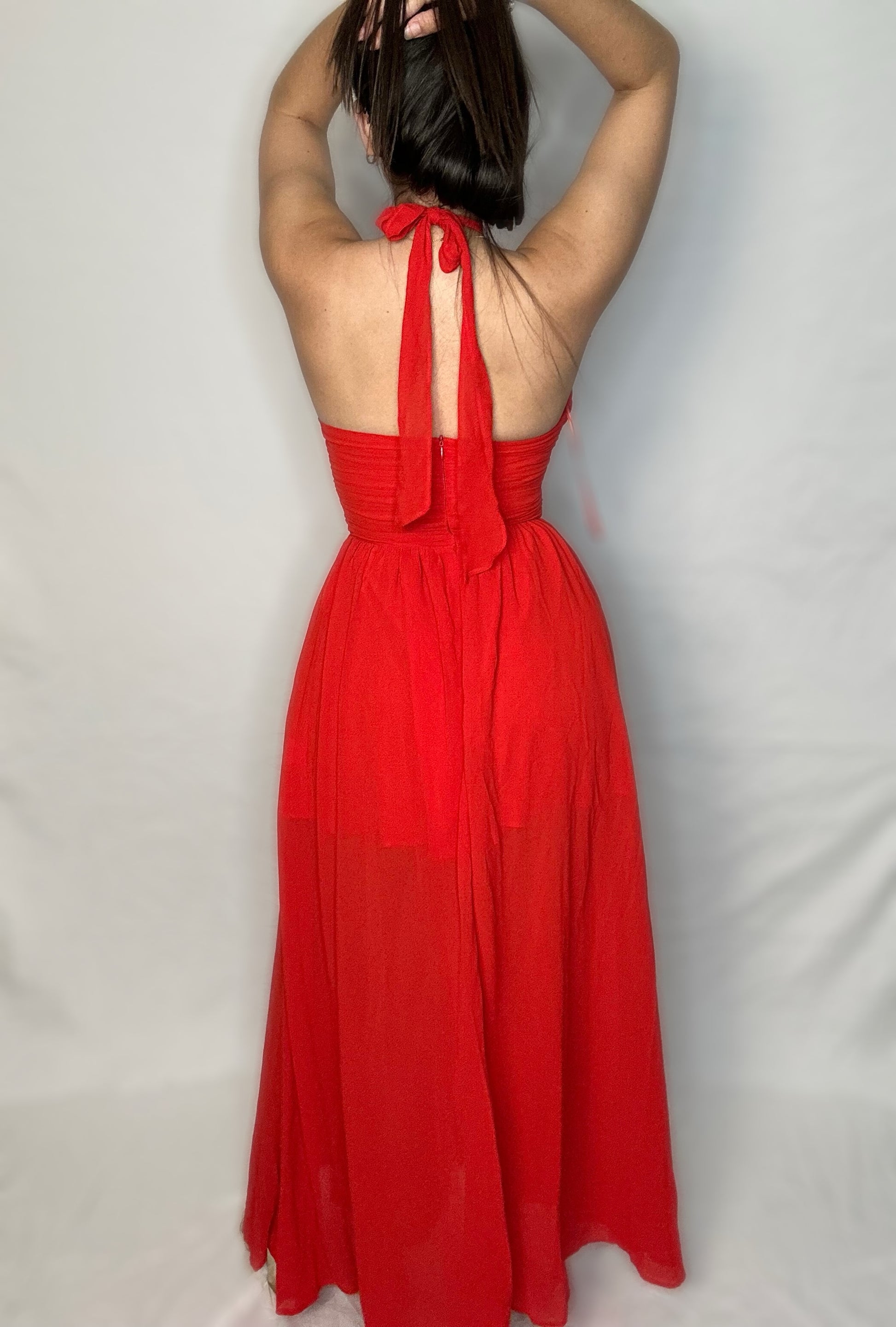 | Description | Cut-out halter maxi dress with back neck tie and front slits. Dress has inner lining. |