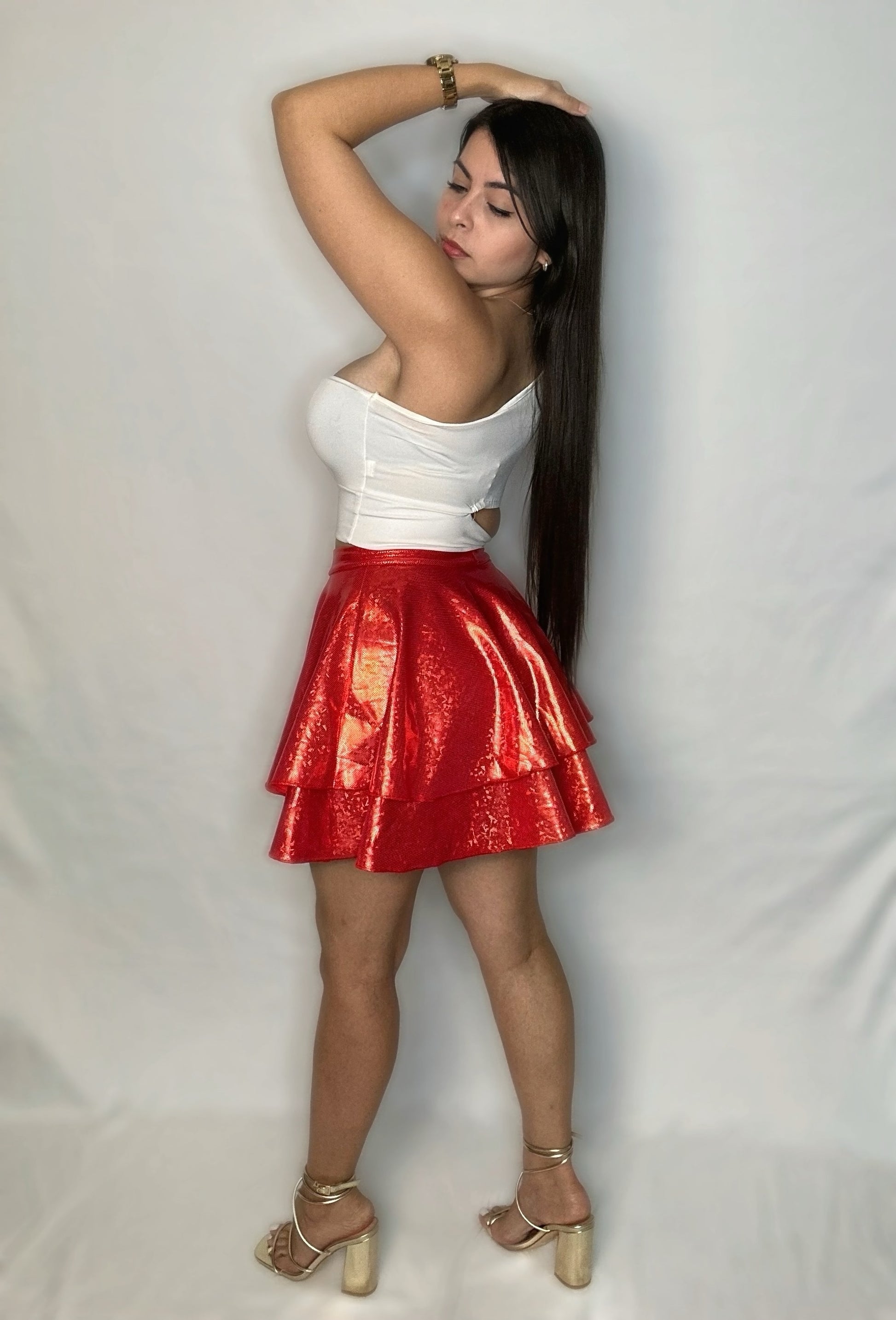 | Description | Mini Skirt with a flirty layered design and shiny finish. |