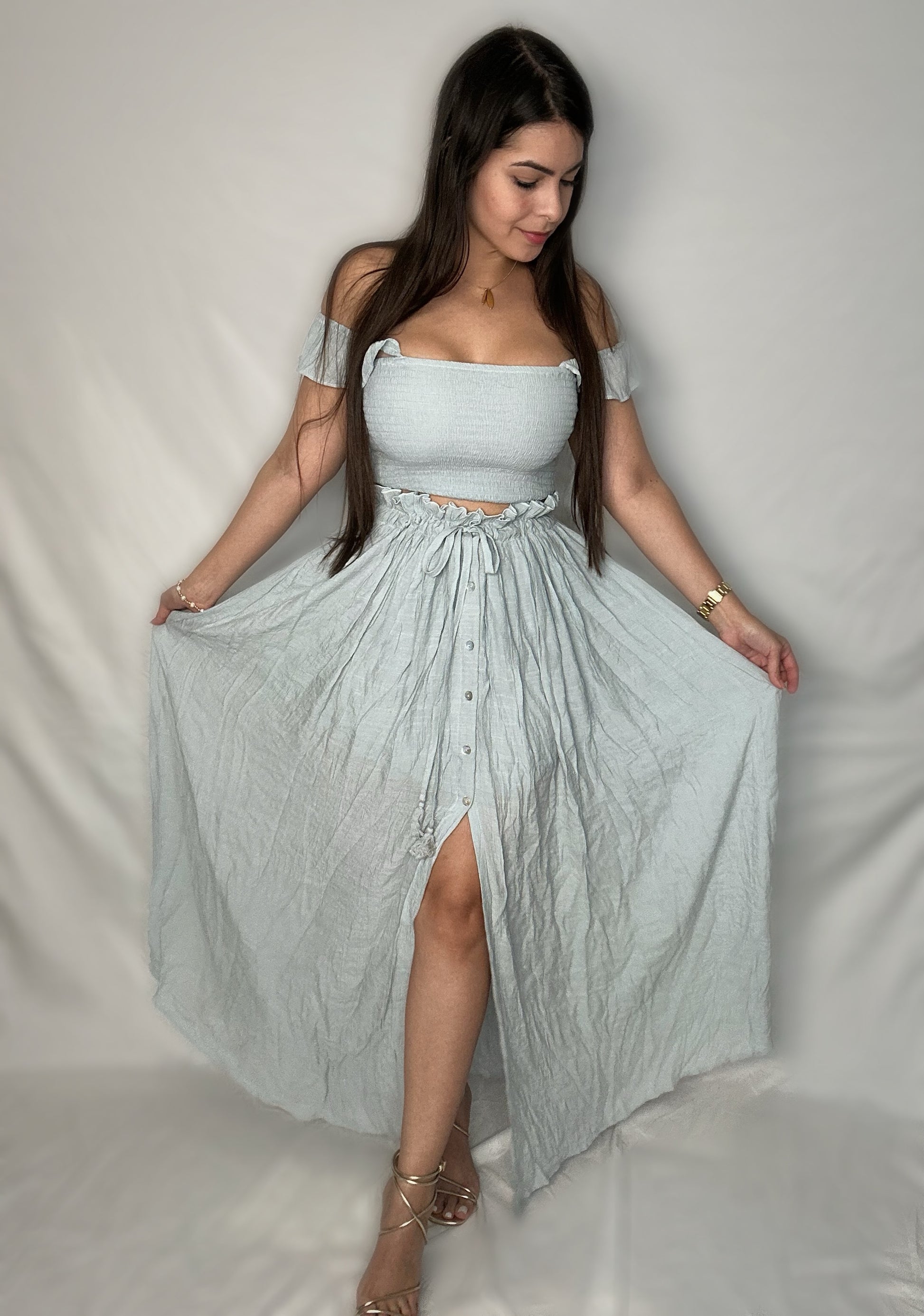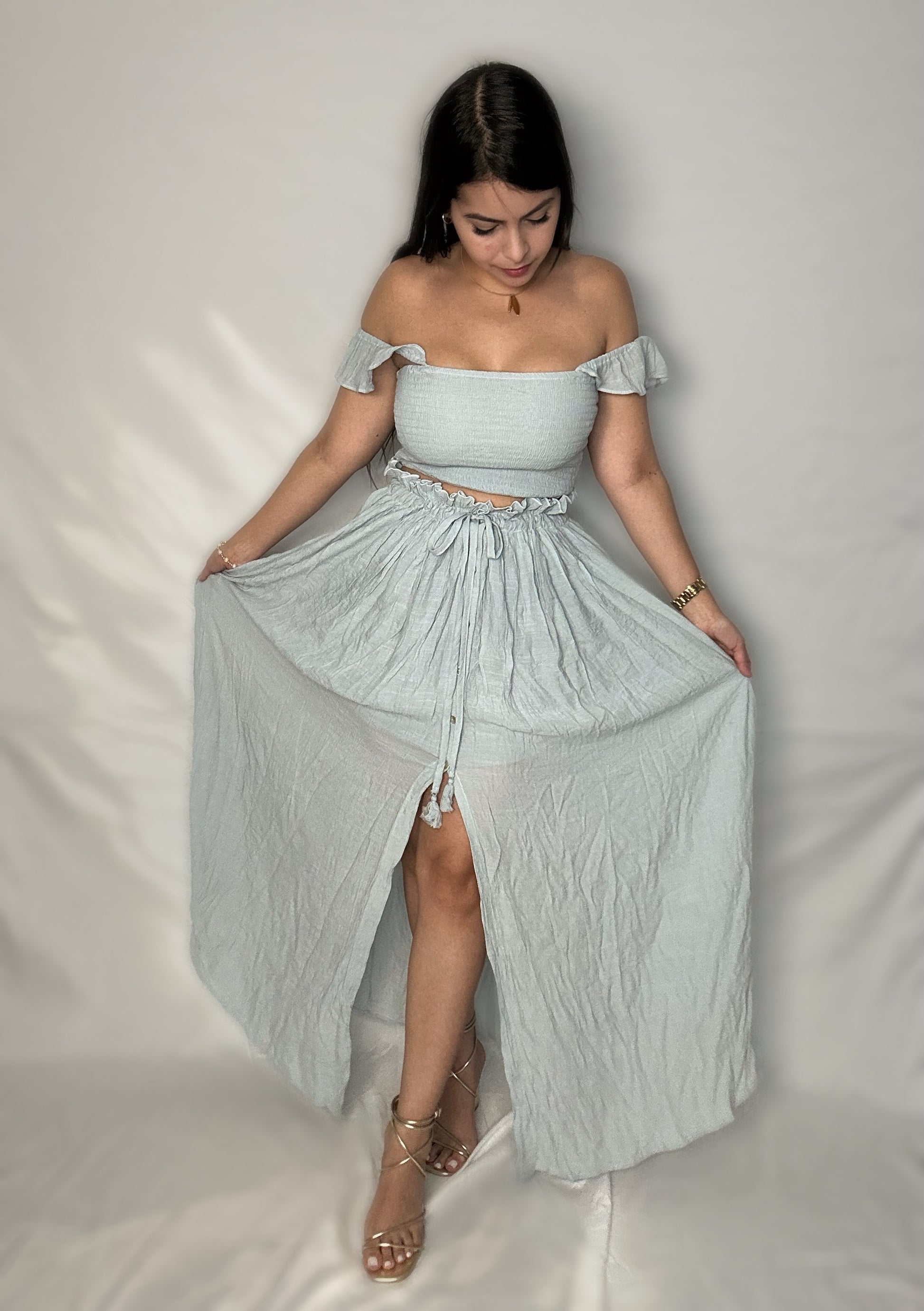 | Description | Smocked crop top with ruffled shoulder straps, high-waisted skirt cinched by drawstrings. |