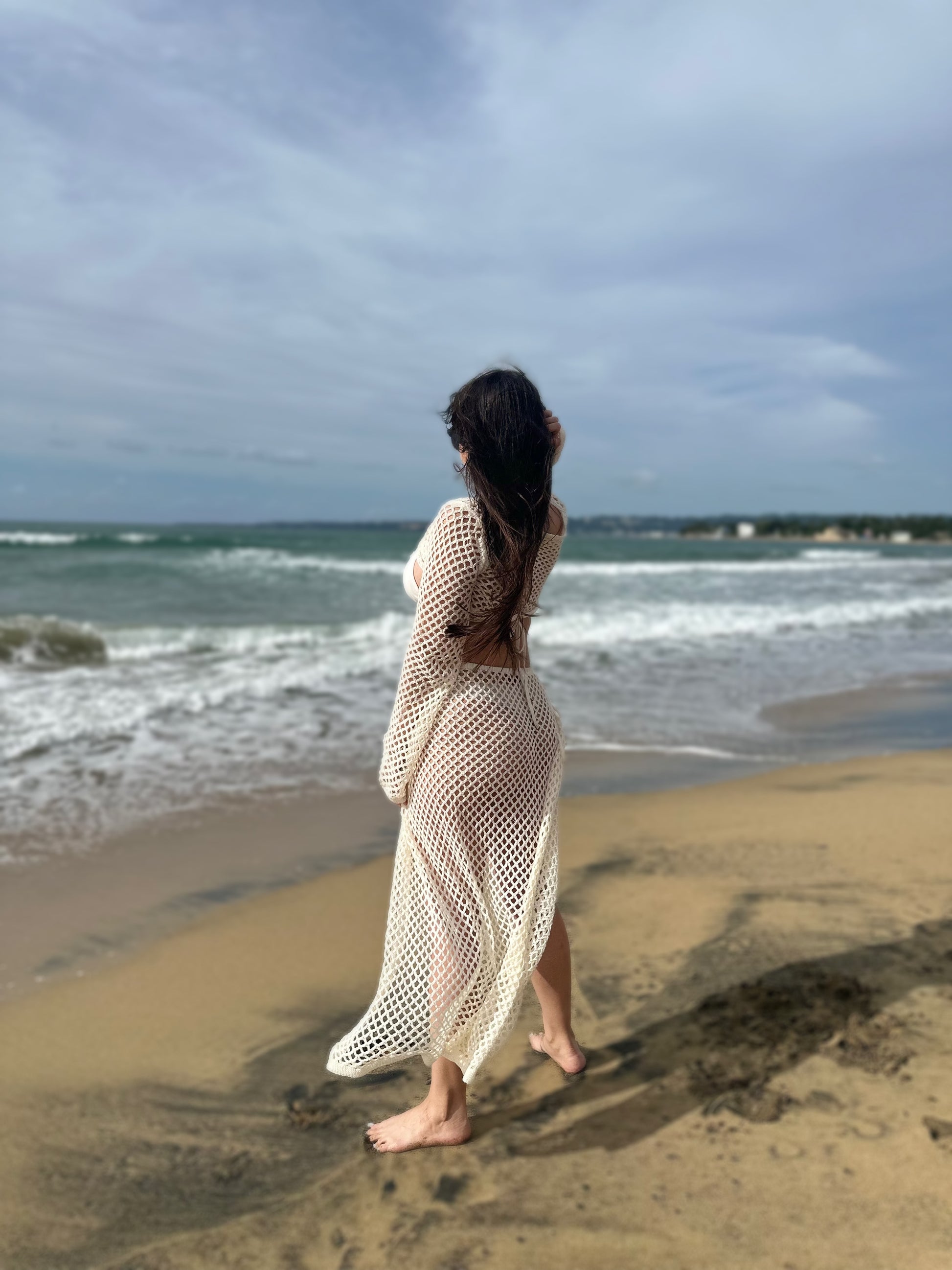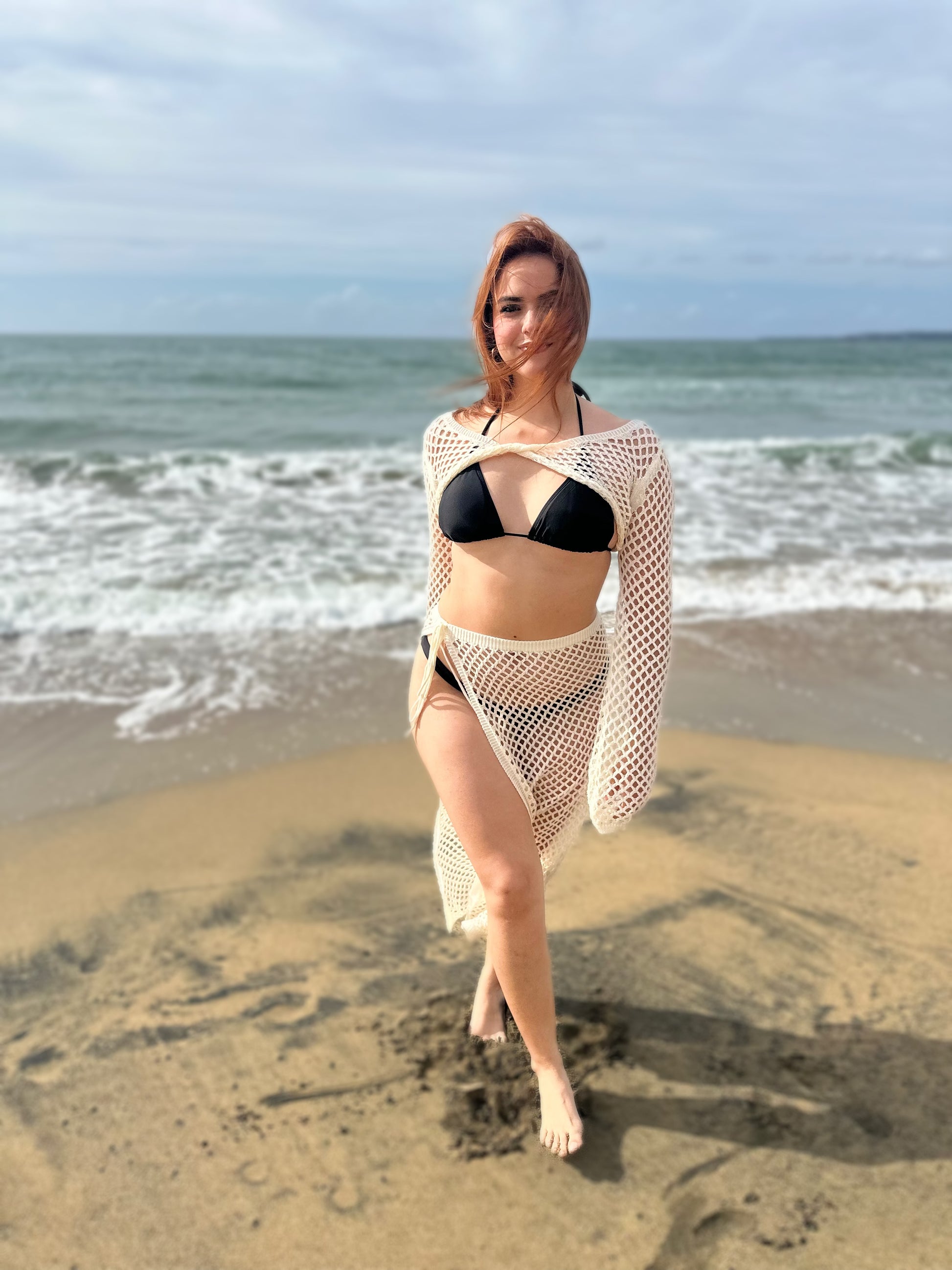 Turn heads and own the shore with this unforgettable beach cover-up set. The open-stitch top features a flattering knotted bust, long sleeves, and a cropped cut that pairs effortlessly with the matching high-waisted skirt. The fitted maxi hem and breezy mesh fabric give you that “effortless glam” vibe — just throw it over your bikini and go. Details: -Mesh knit fabric with open-stitch design -Long sleeve top with twist front and crop length -High-waisted skirt with a fitted maxi hem -Unlined, lightweight & breathable |