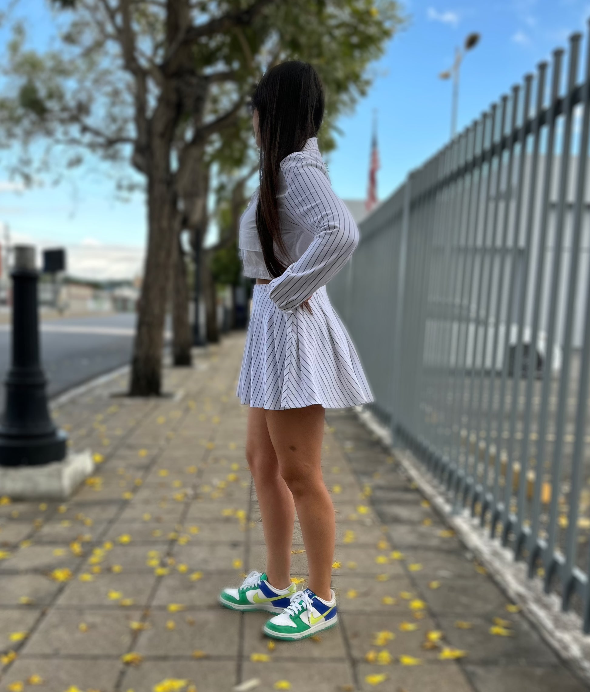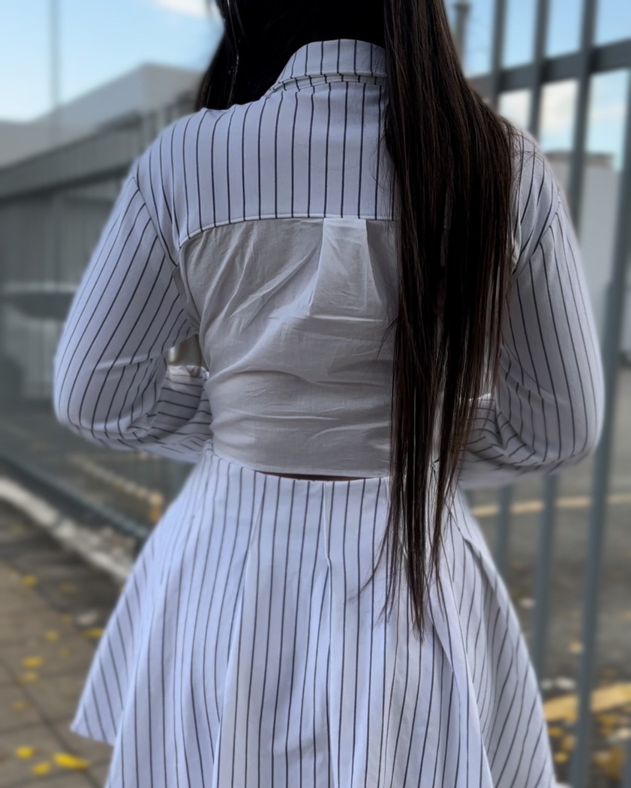 | Description | Cropped button-up shirt with contrast stripes and a flared mini skirt with zipper on the side. |